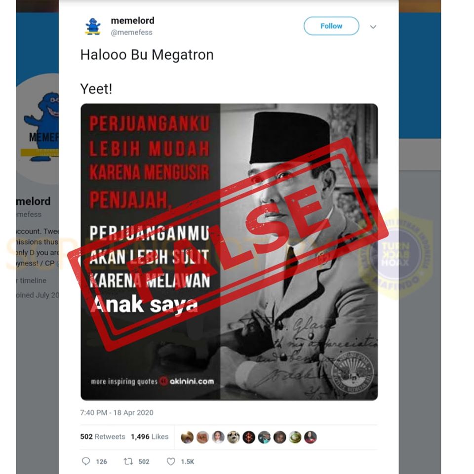 Beredar meme sarkasme pada akun Twitter @memefess dengan karikatur wajah Presiden Pertama. Ir Soekarno dengan narasi pelintiran “PERJUANGANKU LEBIH MUDAH MELAWAN PENJAJAH PERJUANGANMU AKAN LEBIH SULIT KARENA MELAWAN ANAK SAYA” yang diketahui anak dari Ir Soekarno tersebut adalah Ibu Megawati Soekarnoputri yang kini menjabat di salah satu petinggi partai PDIP.
