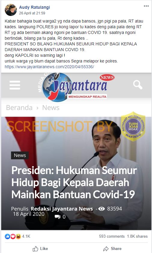 “Kabar bahagia buat warga2 yg nda dapa bansos, jgn pigi pa pala, RT atau kades. langsung POLRES jo kong lapor tu kades deng pala pala deng RT RT yg ada bermain akang ngoni pe bantuan COVID 19. saatnya ngoni bertindak, bilang pa tu pala, Rt deng kades .. PRESIDENT SO BILANG HUKUMAN SEUMUR HIDUP BAGI KEPALA DAERAH MAINKAN BANTUAN COVID 19. deng KAPOLRI so warning lagi! untuk warga yg blum dapat bansos Segra melapor ke polres. https://www/[dot]jayantaranews[dot]com/2020/04/55336/”