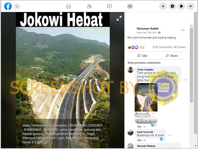 Berdasarkan hasil penelusuran, isu tersebut sudah pernah beredar dan sudah dibahas dalam artikel periksa fakta berjudul “[SALAH] Foto penampakan tol Cisumdawu, Cileunyi-Sumedang-Dawuan yang memangkas dan menerobos bukit” pada 25 Maret 2019 di turnbackhoax.id. Diketahui bahwa, gambar jalan itu merupakan Jalan Raya D400 Mersin-Antalya di Turki.