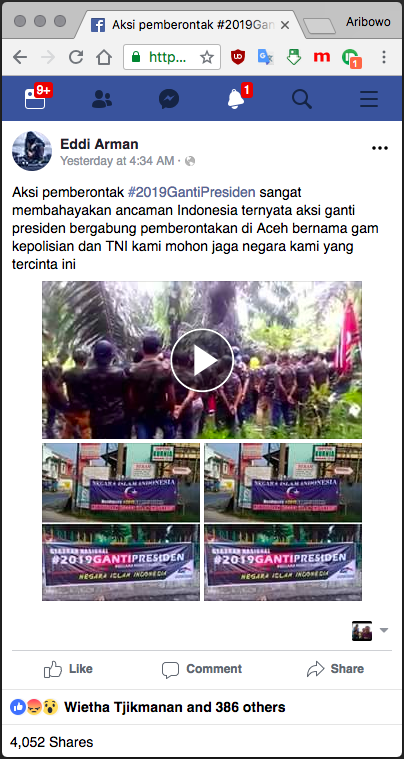 “Aksi pemberontak #2019GantiPresiden sangat membahayakan ancaman Indonesia ternyata aksi ganti presiden bergabung pemberontakan di Aceh bernama gam kepolisian dan TNI kami mohon jaga negara kami yang tercinta ini”.