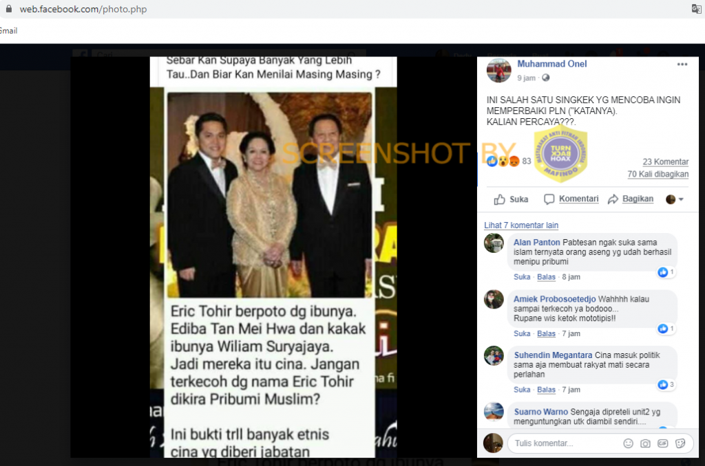 “Sebar Kan Supaya Banyak Yang Lebih Tau..Dan Biar Kan Menilai Masing Masing? Eric Tohir berpoto dg ibunya. Ediba Tan Mei Hwa dan kakak ibunya Wiliam Suryajaya. Jadi mereka itu cina. Jangan terkecoh dg nama Eric Tohir dikira pribumi muslim? Ini bukti trll banyak etnis cina yg diberi jabatan,” tulisan dalam unggahan foto Menteri Badan Usaha Milik Negara (BUMN), oleh akun Facebook Muhammad Onel atau @muhammad.haim.5, Kamis (7/5).