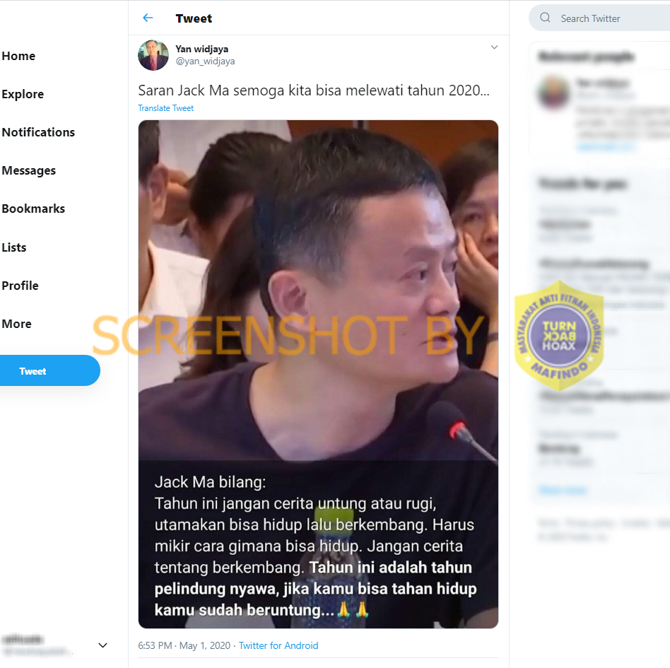 Di akun Twitter-nya, Jack Ma juga tidak pernah menyinggung bahwa tahun 2020 hanyalah tahun untuk bertahan hidup. Berdasarkan pencarian lanjutan pada akun @JackMa di Twitter dengan kata kunci “2020 staying alive”, dinyatakan bahwa “tidak ada yang muncul untuk pencarian tersebut”.