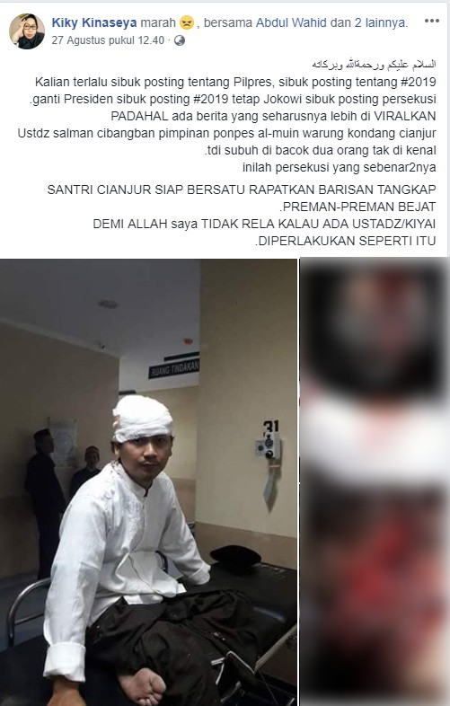 Ustaz Salman Al Farizi, pemilik Pondok Pesantren Al Mu’in Ciwalen, Warungkondang, Kabupaten Cianjur dikabarkan menjadi korban tindakan persekusi dan sempat dibacok. Akan tetapi, setelah ditelusuri, kabar tersebut kurang tepat. Sebab, dilansir dari republika.co.id dan tribunnews.com, Salman mengaku dirinya dipukul dengan benda tumpul oleh dua orang yang tidak dikenal saat keluar rumah untuk membangunkan santrinya jam 04.04 WIB (27/08). “Tidak di jalan gang dua orang sepertinya sudah menunggu, saya dipukul dari belakang sampai terjatuh,” kata Salman.