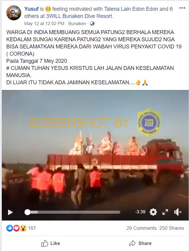 Beredar sebuah unggahan video Facebook mengenai warga India yang membuang patung berhala ke sungai karena patung tersebut tidak bisa menolong mereka dari wabah virus Corona. Narasi juga mengaitkan bahwa hanya Tuhan Yesus jalan keselamatan manusia. Peristiwa itu disebutkan terjadi pada 7 Mei 2020.