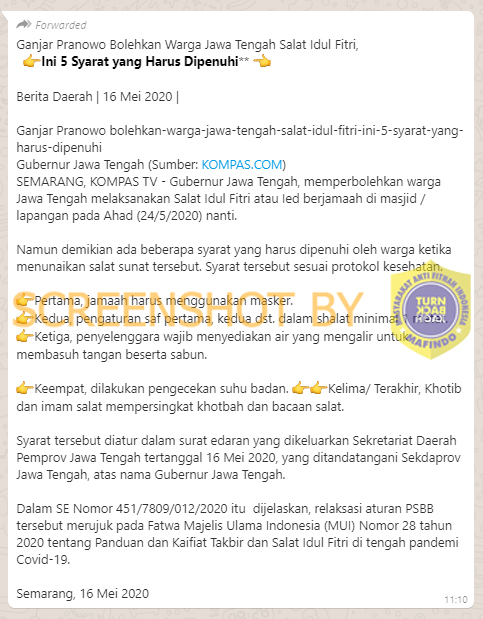Beredar pesan berantai melalui Whatsapp yang berisikan informasi Gubernur Jawa Tengah (Jateng) Ganjar Pranowo memperbolehkan pelaksanaan Salat Idul Fitri asal memenuhi sejumlah persyaratan. Dalam pesan berantai tersebut disebutkan kebijakan itu mengacu pada Surat Edaran Nomor 451/7809/012/2020 dan ditandatangani oleh Sekretaris Daerah (Sekda) Jateng Heru Setiadhie atas nama Gubernur Jateng.