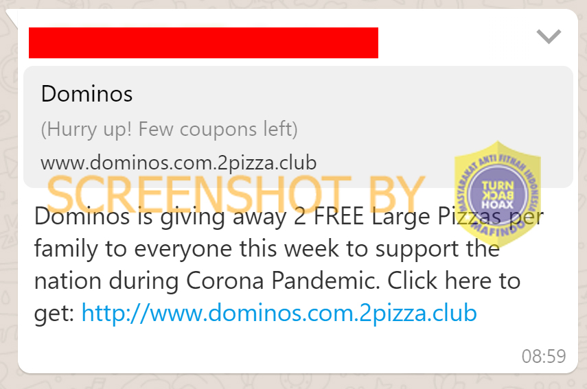 Beredar pesan berantai di Whatsapp yang menyebutkan Domino’s Pizza membagikan voucehr dua pizza besar gratis selama masa pandemi virus Corona atau Covid-19. Saat tautan di dalam pesan itu dibuka diarahkan kepada sebuah survei.