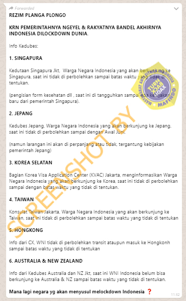 Beredar pesan berantai melalui Whatsapp yang menyatakan bahwa Indonesia di-lockdown dunia lantaran sikap Pemerintah Indonesia yang ngeyel dan kebandelan rakyatnya. Dalam pesan berantai tersebut tercantum beberapa negara yang diklaim melakukan pelarangan kepada WNI untuk masuk negaranya, yakni Singapura, Jepang, Korea Selatan, Taiwan, Hong Kong, serta Australia dan Selandia Baru.
