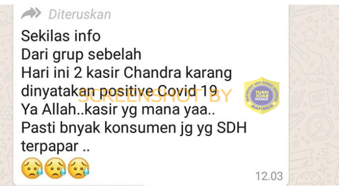 Sementara itu, Staff Promosi Chandra Superstore Apriati juga turut menegaskan bahwa informasi perihal dua kasir positif Covid-19 adalah hoaks. Hal tersebut juga didukung dengan adanya pengecekan dari puskesmas Kampung Sawah. Saat itu petugas kesehatan segera turun langsung untuk mengecek seluruh absensi karyawan dan juga kasir Chandra Superstore. Hasilnya seluruh karyawan diketahui masuk dan dinyatakan dalam keadaan sehat.