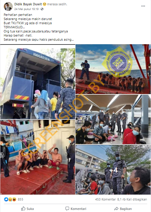 Beredar postingan foto yang diklaim sebagai upaya sapu habis warga negara asing oleh Malaysia. Dalam narasi terdapat imbauan untuk memberitahu para TKI/TKW di Malaysia. Berikut kutipan narasinya: