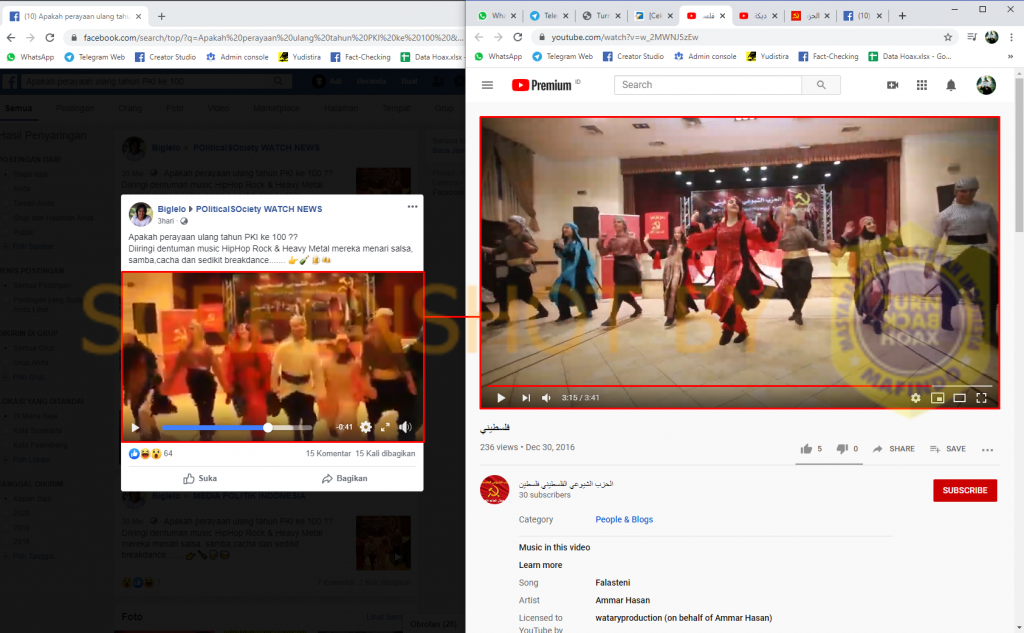 Salah satu video yang identik dengan video yang diunggah sumber adalah video yang diunggah ke kanal Youtube الحزب الشيوعي الفلسطيني فلسطين (Partai Komunis Palestina) dengan judul “فلسطيني” atau yang jika diterjemahkan menjadi “Palestina”
