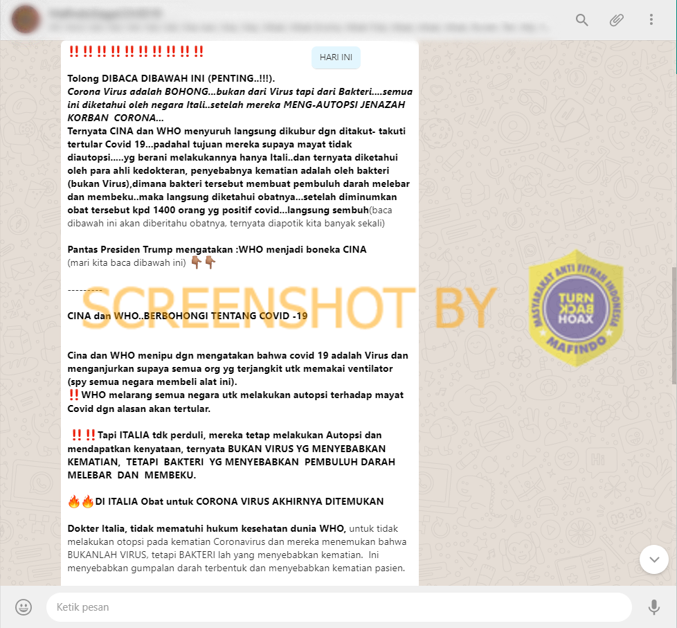 Corona Virus adalah BOHONG...bukan dari Virus tapi dari Bakteri....semua ini diketahui oleh negara Itali..setelah mereka MENG-AUTOPSI JENAZAH KORBAN CORONA...