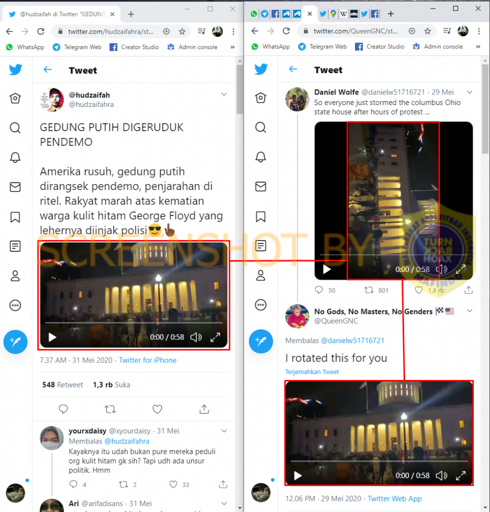 Pencarian gambar terbalik menggunakan tangkapan layar video itu menemukan video yang sama sebelumnya diunggah di akun Twitter Daniel Wolfe pada tanggal 29 Mei 2020.