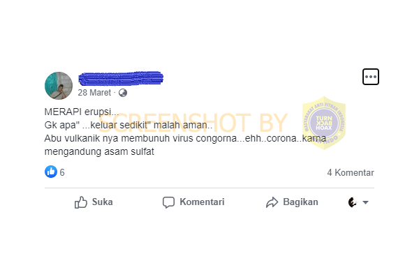 Sebuah akun facebook mengunggah narasi berisi informasi yang mengklaim bahwa abu vulkanik dari gunung merapi bisa membunuh virus corona atau covid-19 karena mengandung asam sulfat.