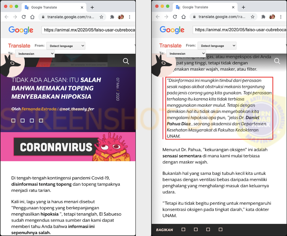 ”Disinformasi ini mungkin timbul dari perasaan sesak napas akibat obstruksi mekanis tergantung pada jenis corong yang kita gunakan. Tapi perasaan terhalang itu karena kita tidak terbiasa menggunakan masker mulut. Tetapi dengan demikian hal itu tidak akan menyebabkan kita mengalami hipoksia apa pun, ”jelas Dr. Daniel Pahua Díaz , seorang akademisi dari Departemen Kesehatan Masyarakat di Fakultas Kedokteran UNAM.”