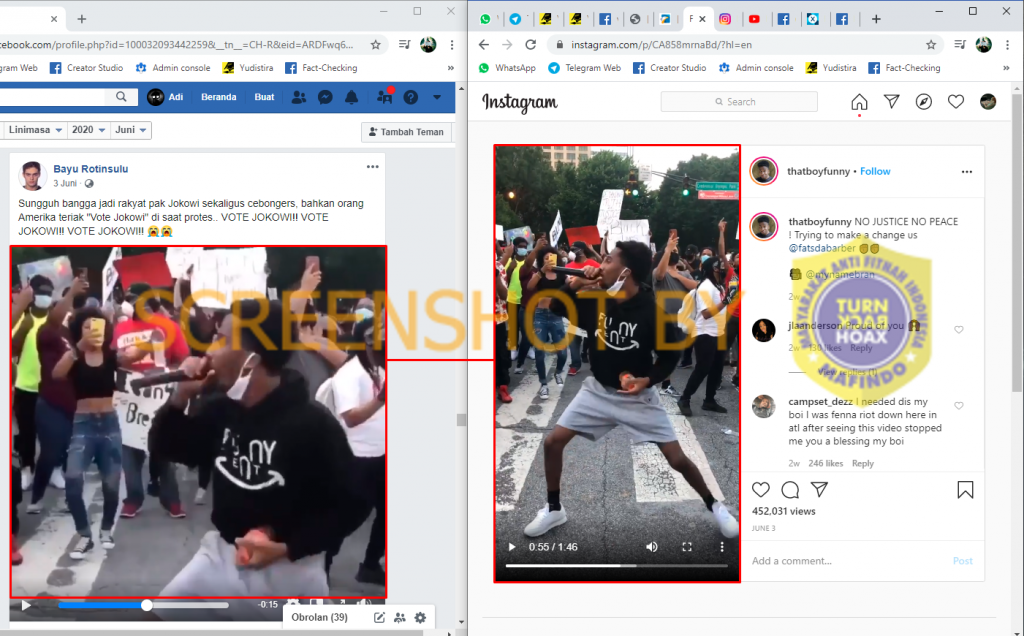 Video yang identik dengan video yang diunggah sumber klaim, diunggah oleh akun Instagram @thatboyfunny pada tanggal 3 Juni 2020 dengan narasi “NO JUSTICE NO PEACE ! Trying to make a change :us: @fatsdabarber”