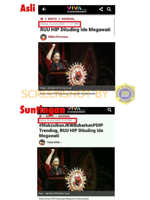 Namun pasca dilakukan penelusuran lebih lanjut, diketahui bahwa tangkapan layar dengan logo viva.co.id tersebut telah melalui proses penyuntingan. Melansir dari viva.co.id, tidak ditemukan artikel dengan judul *#MakzulkanJKWBubarkanPDIP Trending, RUU HIP Dituding Ide Megawati”.