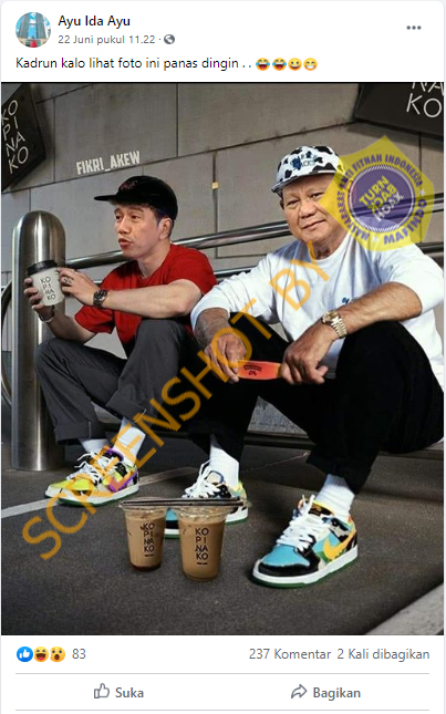 Beredar foto yang menampilkan wajah Presiden Joko Widodo dan Menteri Pertahanan Prabowo Subianto dengan jaket dan beberapa gelas kopi berlogo Kopi Nako.
