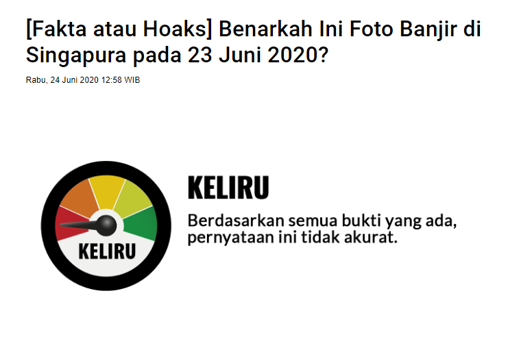 Bukan foto banjir di Bedok, Singapura. Foto itu merupakan foto banjir di Guangzhou, Guangdong, Cina, pada 22 Mei 2020. Meskipun begitu, di Singapura, memang terjadi banjir bandang pada 23 Juni 2020.
