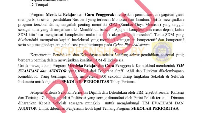 Beredar surat mengenai seleksi sekolah prioritas berkop Kementerian Pendidikan dan Kebudayaan (Kemendikbud)dalam rangka program merdeka belajar dan guru penggerak.