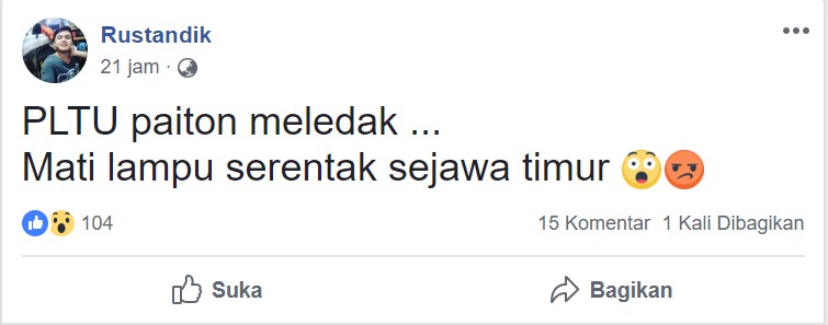 Kabar yang menyebutkan listrik padam di wilayah Probolinggo dan sekitarnya akibat meledaknya Pembangkit Listrik Tenaga Uap (PLTU) Paiton merupakan informasi yang tidak benar. Dilansir dari www.timesindonesia.co.id dan wartabromo.com , Sukirman Hadi Prayitno selaku Supervisor Umum dan CSR PT. Pembangkit Jawa Bali (PJB) Unit Pembangkit (UP) Paiton menegaskan, gangguan listrik yang terjadi bukan disebabkan meledaknya PLTU Paiton. Atas gangguan itu, lanjut Sukirman, suplai listrik menjadi tidak maksimal. “Gak ada, hoaks itu. Ngawur itu. Seluruh sistem Jawa Bali yang gangguan. Lebih detailnya PLN APP Probolinggo yang lebih paham,” tegasnya.