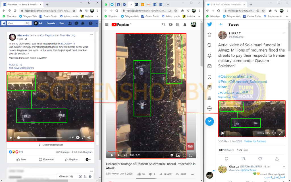 Video yang sama, dengan rotasi yang sama dengan video di sumber klaim juga diunggah di Twitter pada tanggal 5 Januari 2020. Diterjemahkan dari bahasa Inggris ke bahasa Indonesia, kicauan itu berbunyi: “Video udara pemakaman Soleimani di Ahvaz, Jutaan pelayat membanjiri jalan-jalan untuk memberi penghormatan kepada komandan militer Iran Qassem Soleimani.”