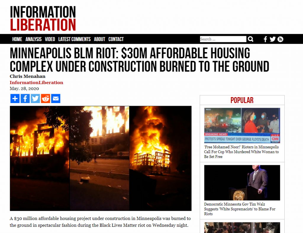 Foto dan video saat-saat terbakarnya gedung tersebut di rangkum dalam artikel berjudul “Minneapolis BLM Riot: $30M Affordable Housing Complex Under Construction Burned to The Ground” yang dimuat di situs informationliberation.com pada 28 Mei 2020.
