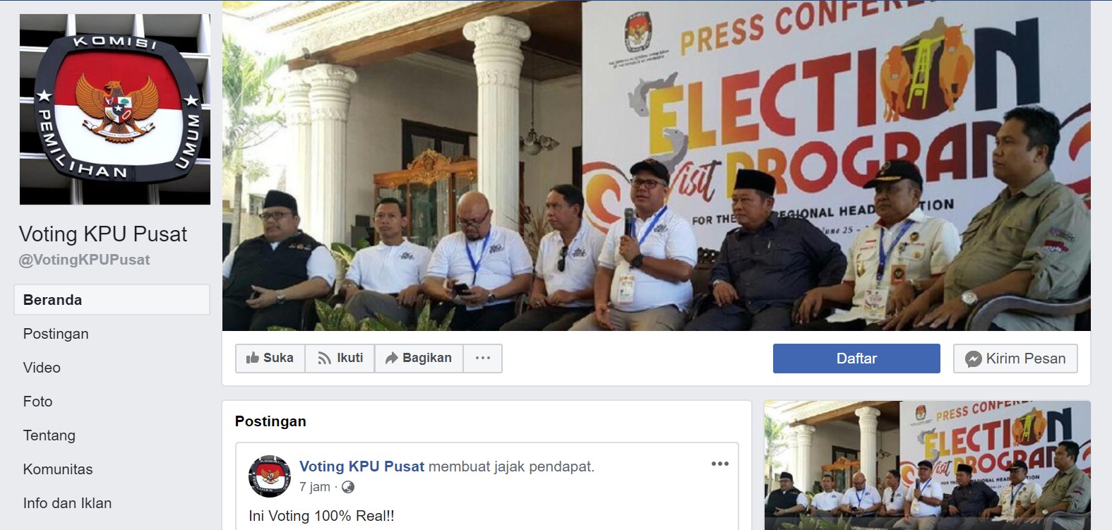 Komisi Pemilihan Umum (KPU) menegaskan bahwa Fanpage Facebook atas nama Voting KPU Pusat yang melakukan voting pemilihan Calon Presiden (Capres) bukanlah milik lembaga tersebut. Bantahan itu disampaikan KPU melalui pers rilis yang ditulis oleh tim Humas KPU. Dilansir dari viva.co.id, kumparan.com, dan alinea.id, tim Humas KPU menyebutkan dalam rilisnya bahwa KPU tidak pernah melakukan voting terkait pemilihan Capres yang akan berlaga di Pemilihan Umum (Pemilu) 2019 nanti. “KPU tidak pernah dan tidak akan pernah melakukan Voting terkait Pemilihan Presiden-Wakil Presiden dan/atau Pemilihan Legislatif,” tulis tim Humas KPU dalam rilisnya.