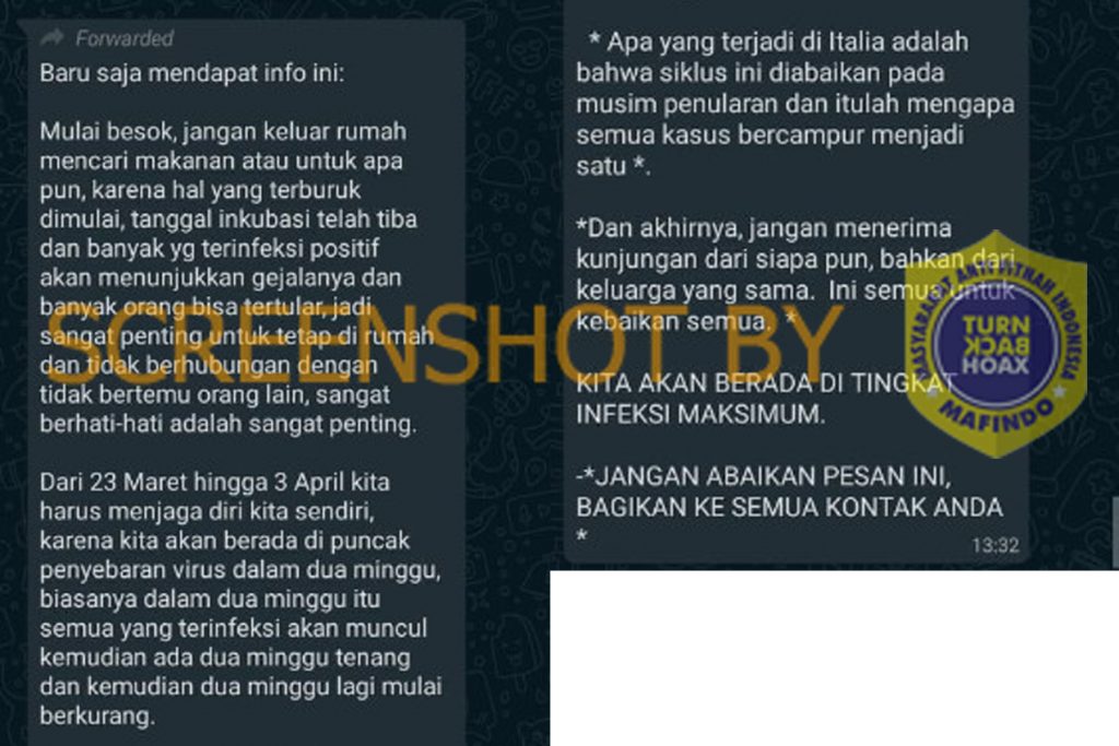 Beredar sebuah pesan berantai WhatsApp yang berisi larangan keluar rumah pada tanggal 23 Maret sampai dengan 3 April (versi lain mengatakan 28 Maret). Berdasarkan pesan tersebut, larangan tersebut diterapkan karena pada tanggal-tanggal tersebut terjadi puncak penyebaran virus corona. Pesan ini diakhiri dengan kalimat yang khas, yakni untuk disebarkan ke kontak-kontak lainnya.