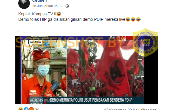 Beredar sebuah unggahan melalui media sosial Facebook oleh akun @Ceullen, perihal klaim bahwa stasiun TV yakni Kompas TV tidak menyiarkan situasi demo penolakan RUU HIP di depan Gedung MPR/DRP Rabu, 24 Juni 2020 lalu. Hingga saat ini unggahan @Ceullen telah mendapat 12 komentar dan dibagikan oleh 22 pengguna Facebook lainnya.