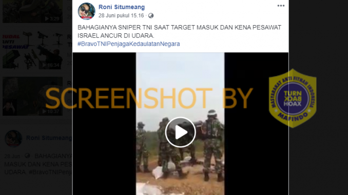 Bedasarkan hasil penelusuran Tim Cek Fakta Medcom, klaim adanya video Sniper TNI yang menjadikan pesawat Israel sebagai target dan ditembak sampai hancur di udara adalah klaim yang salah.