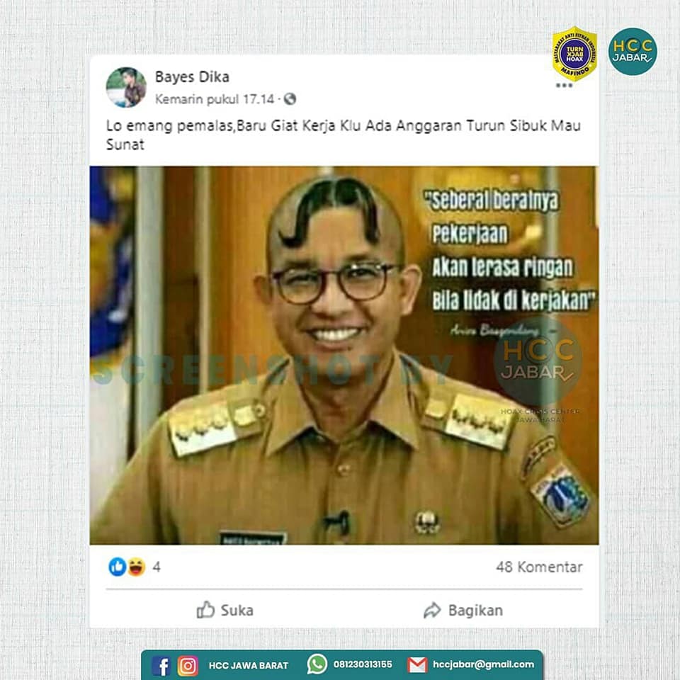 Akun Facebook Bayes Dika atau @bayes.dika mengunggah foto Gubernur DKI Jakarta, Anies Baswedan yang ditambahkan kutipan “Seberat beratnya Pekerjaan Akan terasa ringan Bila tidak di kerjakan,” pada Sabtu (4/7).