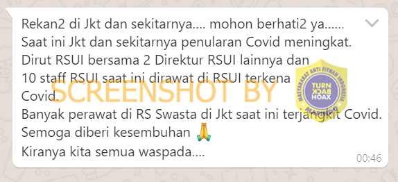 Beredar pesan berantai Whatsapp yang menyebutkan bahwa Direktur Utama Rumah Sakit Universitas Indonesia (RSUI) bersama dua direktur dan 10 staff terkena virus Corona atau Covid-19.
