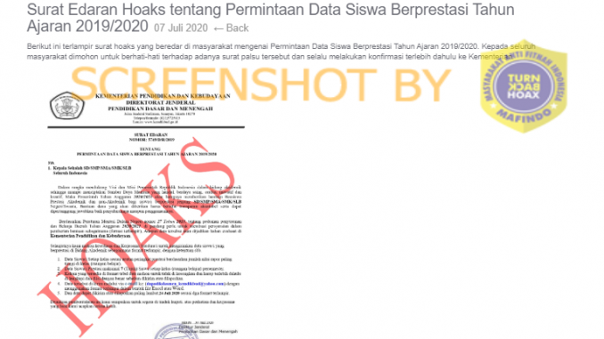 Melansir dari kemendikbud.go.id, dinyatakan bahwa berisi informasi “PERMINTAAN DATA SISWA BERPRESTASI TAHUN AJARAN 2019/2020” adalah palsu alias hoaks. Kemendikbud mengimbau kepada seluruh masyarakat agar berhati-hati dalam menyerap informasi yang tidak mempunyai kejelasan sumber valid. Diharapakan masyarakat selalu melalukan pencarian informasi melalui media sosial atau situs resmi milik Kementerian.