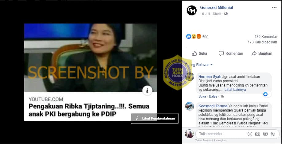 Akun Facebook Generasi Milenial mengunggah sebuah gambar tangkapan layar video di YouTube dengan narasi “Pengakuan Ribka Tjiptaning..!!!. Semua anak PKI bergabung ke PDIP” pada 6 Juli 2020. Unggahan tersebut telah mendapatkan respon sebanyak 500 reaksi, 137 komentar, dan telah dibagikan sebanyak 173 kali.