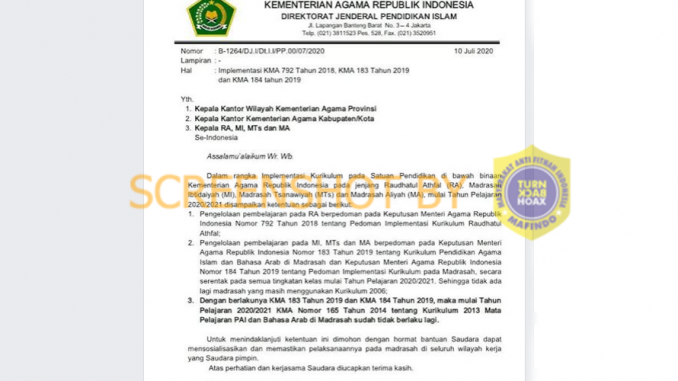 Akun Bintang Anggara (fb.com/bintang.anggara.3194) mengunggah gambar surat berkop Kementrian Agama Republik Indonesia – Direktorat Jenderal Pendidikan Islam perihal Implementasi KMA 792 Tahun 2018, KMA 183 Tahun 2019 dan KMA 184 tahun 2019 dengan narasi sebagai berikut: