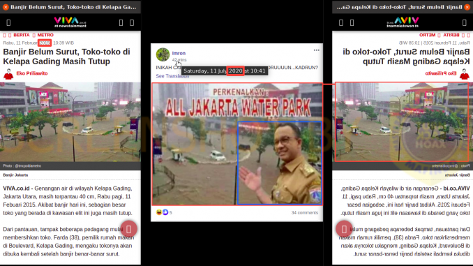 Hoaks Lama Beredar Kembali (HLBK). Hasil suntingan foto banjir tahun 2015, orientasi kiri-kanan dibalik (flip) dan ditambahkan foto Anies Baswedan.