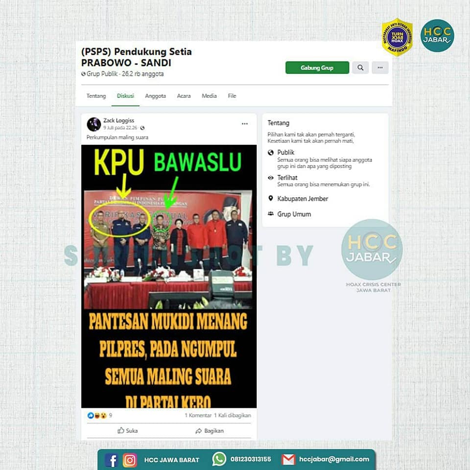 Akun Facebook Zack Loggiss atau @zack.loggiss mengunggah foto yang didalamnya terdapat Ketua Umum Partai Demokrasi Indonesia Perjuangan (PDIP), Megawati Soekarnoputri, beserta Sekretaris Jendral (Sekjen), Hasto Kristiyanto dan beberapa komisioner KPU serta Bawaslu.