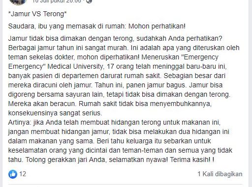 “Pesan berantai tersebut pada dasarnya tidak memiliki dasar apa pun, termasuk tidak adanya sumber yang valid yang menyertai pesan tersebut. Namun yang juga perlu diketahui, Terung akan beracun jika dikonsumsi mentah, dan tidak semua jamur dapat dikonsumsi. Pesan berantai mengenai jamur vs terung ini setidaknya sudah ada sejak 2015”