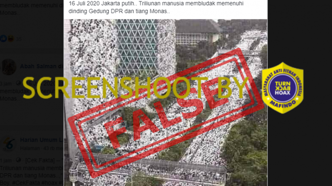 Foto editan dan bukan foto 16 Juli 2020. Foto aslinya, adalah foto momen terkait dengan aksi 2 Desember 2016 atau 212. Di foto asli, massa berpakaian putih-putih itu memenuhi jalan M.H. Thamrin di sekitaran gedung Kementerian Koordinator Kemaritiman dan Investasi serta Kementerian Agama.