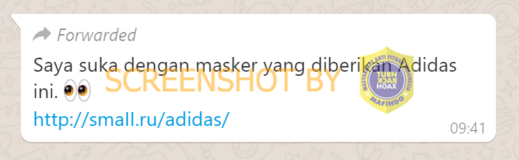 Beredar pesan berantai melalui Whatsapp yang menyebutkan Adidas memberikan masker. Dalam pesan berantai tersebut terdapat tautan.