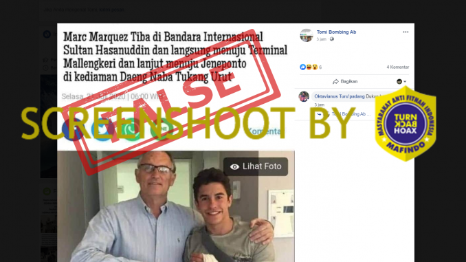 Akun Tomi Bombing Ab (fb.com/tomiab40) mengunggah sebuah gambar yang seolah tangkapan layar dari artikel berjudul “Marc Marquez Tiba di bandara Internasional Sultan Hasanuddin dan langsung menuju Terminal Mallengkeri dan lanjut menuju Jeneponto di kediaman Daeng Naba Tukang Urut”