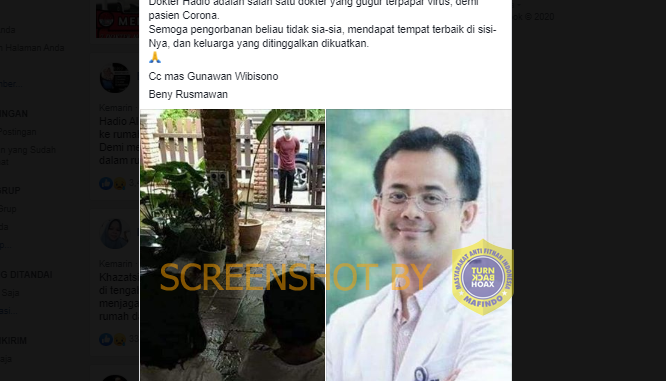 Beredar postingan di media sosial facebook oleh akun Baiq WinaNisa yang berisi foto seseorang yang diklaim sebagai almarhum dr. Hadio Ali Khazatsin, Sp.S yang menemui anak-anaknya dan hanya bisa melihat dari luar pagar sebelum wafat akibat bertugas dan terinfeksi virus Covid-19.