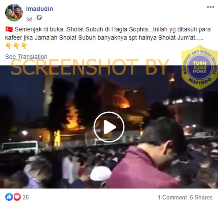 Akun Facebook Imadudin mengunggah sebuah video berdurasi 3.08 menit di laman pribadinya dengan narasi “Semenjak di buka, Sholat Subuh di Hagia Sophia...Inilah yg ditakuti para kafeer jika Jama'ah Sholat Subuh banyaknya spt halnya Sholat Jum'at..... 👇👇👇” pada 21 Juli 2020. Unggahan tersebut telah mendapatkan respon sebanyak 26 reaksi, 1 komentar, dan telah dibagikan sebanyak 6 kali.