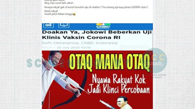 “OTAQ MANA OTAQ Nyawa Rakyat Kok Jadi Klinci Percobaan Kalo sama Binatang sih Gpp,”, gambar yang diunggah akun Facebook Mufida Sbj atau @mufida.sholehah.3 dengan logo media daring CNBC dan judul berita “Doakan Ya, Jokowi Beberkan Uji Klinis Vaksin Corona RI, Kamis (23/7).