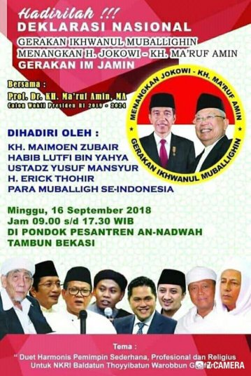 Poster “Deklarasi Nasional Gerakan Ikhwanul Muballihghin Menangkan Jokowi – KH. Ma’ruf” yang diselenggarakan di Pondok Pesantren An-Nadwah, Tambun, Bekasi, pada Minggu (16/9) beredar di media sosial.