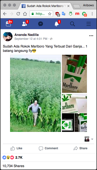 Hoaks di 2015 yang didaur ulang, Tribun: “‘Marlboro M’, Rokok Ganja Terbaru Harga Rp 1,2 Juta Per Bungkus Ternyata Kabar Hoax”. Selengkapnya di bagian PENJELASAN dan REFERENSI.