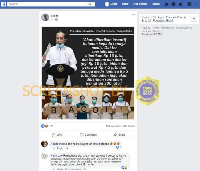 Akun Facebook bernama Syam mengunggah status pada tanggal 27/07/2020 yang berisi sebuah foto tenaga medis merangkai kata ‘B-A-C-O-T-!’. Di atasnya terdapat foto Jokowi sedang berpidato dengan narasi Jokowi memberi insentif kepada tenaga medis.