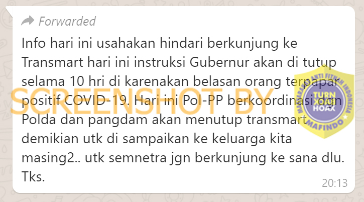 “Info hari ini usahakan hindari berkunjung ke Transmart hari ini instruksi Gubernur akan di tutup selama 10 hri di karenakan belasan orang terpapar positif COVID-19. Hari ini Pol-PP berkoordinasi dgn Polda dan pangdam akan menutup transmart demikian utk di sampaikan ke keluarga kita masing2.. utk semnetra jgn berkunjung ke sana dlu. Tks.”