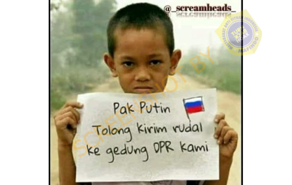 Akun facebook bernama Yanne Ratih mengunggah foto seorang bocah yang menunjukkan kertas bertuliskan “Pak Putin Tolong Kirim Rudal Ke Gedung DPR Kami”.