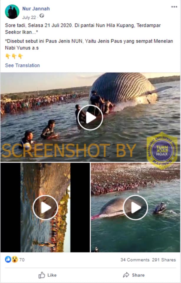 Akun Facebook bernama Nur Jannah mengunggah narasi mengenai terdamparnya ikan paus nun di pantai Nunhila, Kupang, yang disertai dengan sebuah foto dan beberapa video pada 22 Juli 2020. Unggahan tersebut telah mendapat respon sebanyak 70 reaksi, 34 komentar, dan telah dibagikan sebanyak 291 kali.